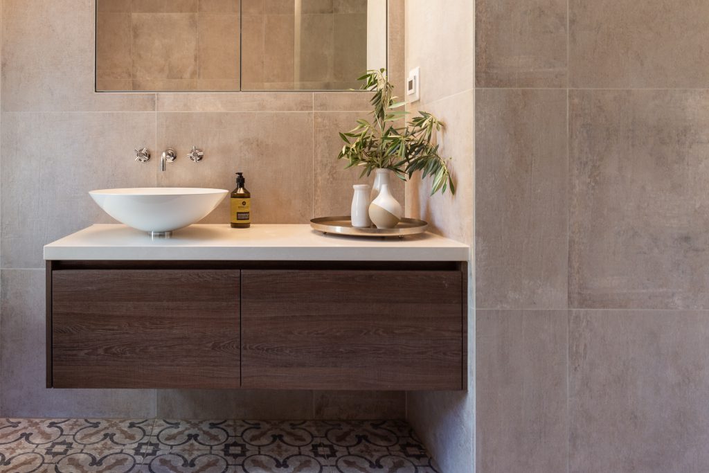 Rose gold may be over with, but more organic pared-back metals such as brushed nickel, living bronze and brass, along with gunmetal are big winners in bathrooms right now. They create a beautiful statement piece and contrast.
