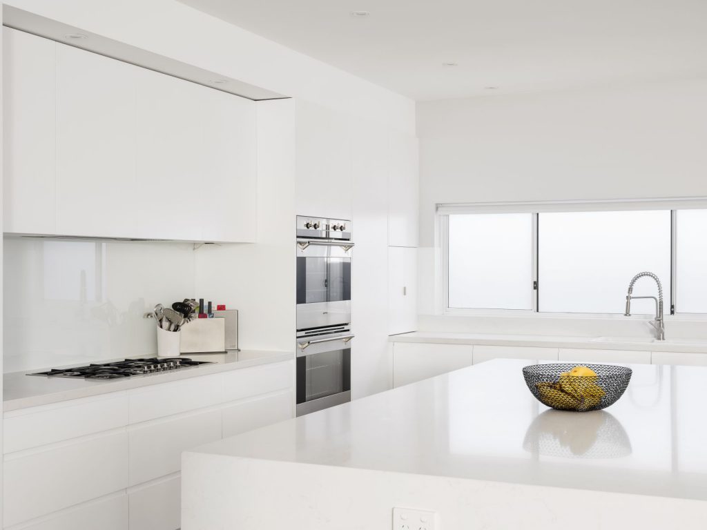 Any reconstituted stone such as Caesarstone, Silestone, Essa Stone or Smartstone are bound by resin, so cannot be used as a splashback with a gas cooktop, because of the naked flame. However, it’s perfect with an induction or electric cooktop. It’s super easy to clean ,and provides a streamlined continuous look with your benchtop.