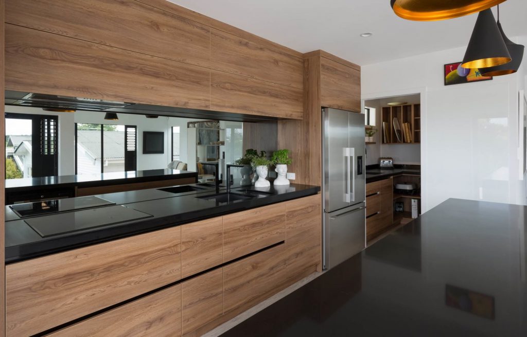 A similar aesthetic to stone, porcelain or Dekton can create a seamless look by wrapping your stone benchtop up the wall as a splashback. The advantage with porcelain or Dekton is that both are fire-resistant, so it’s possible to use with a gas cooktop aswell as induction.